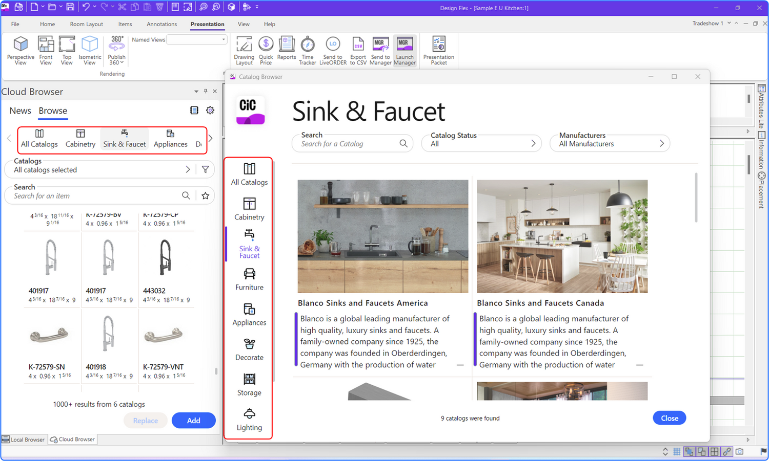 We provides one of the largest collections of kitchen and bathroom design catalogs available. Our application offers online configurable cabinetry, appliance, countertops, flooring and plumbing catalogs via Cloud. Design Flex manufacturer catalog content gives you the opportunity to specify and visualize designs with real products.